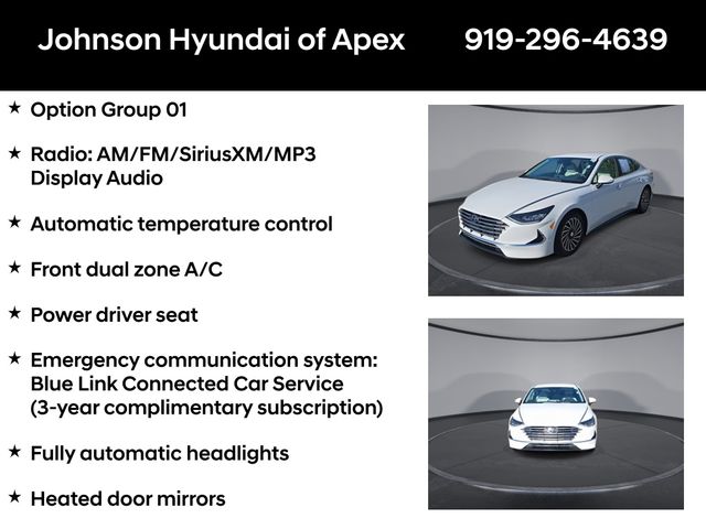Apple CarPlay & Android Auto, Automatic temperature control, Emergency communication system: Blue Link Connected Car Service (3-year complimentary subscription), Front dual zone A/C, Fully automatic headlights, Heated door mirrors, Heated Front Bucket Seats, Option Group 01, Outside temperature display, Power driver seat, Power passenger seat, Radio: AM/FM/SiriusXM/MP3 Display Audio, Telescoping steering wheel.