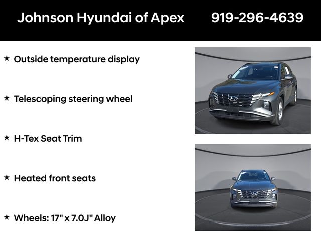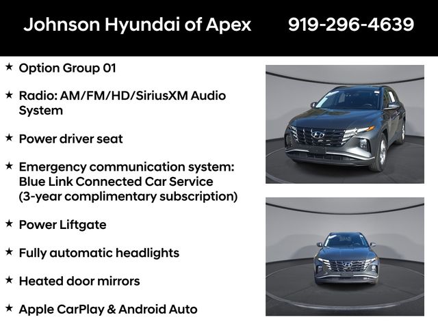 Apple CarPlay & Android Auto, Emergency communication system: Blue Link Connected Car Service (3-year complimentary subscription), Fully automatic headlights, H-Tex Seat Trim, Heated door mirrors, Heated front seats, Option Group 01, Outside temperature display, Power driver seat, Power Liftgate, Radio: AM/FM/HD/SiriusXM Audio System, Telescoping steering wheel, Wheels: 17" x 7.0J" Alloy.