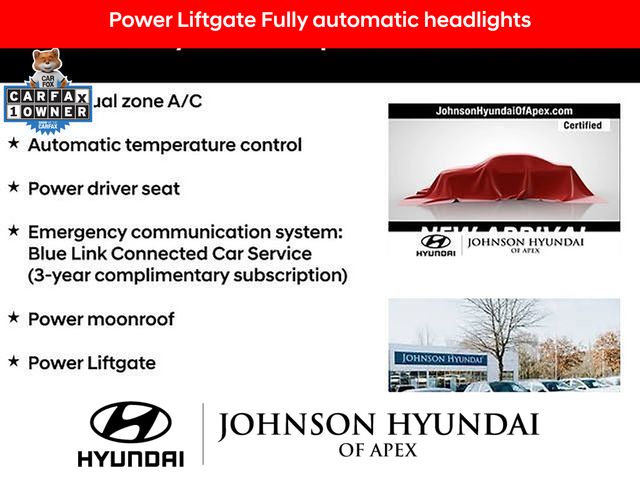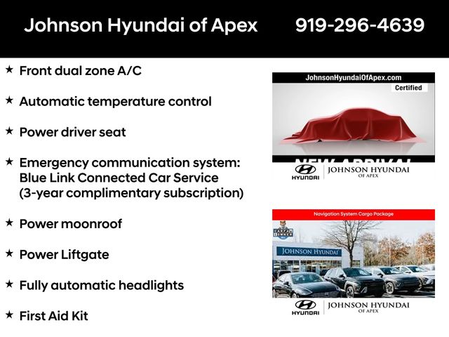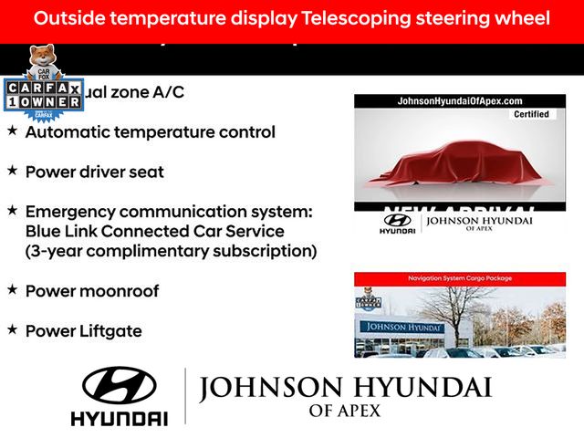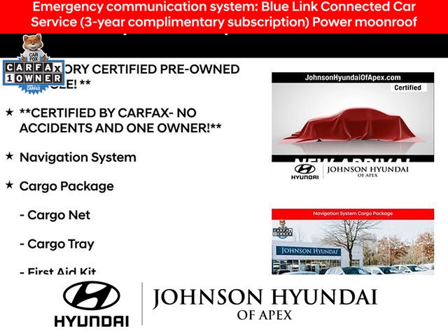 **FACTORY CERTIFIED PRE-OWNED VEHICLE! **, **CERTIFIED BY CARFAX- NO ACCIDENTS AND ONE OWNER!**, Apple CarPlay & Android Auto, Auto-dimming Rear-View mirror, Automatic temperature control, Cargo Net, Cargo Package, Cargo Tray, Emergency communication system: Blue Link Connected Car Service (3-year complimentary subscription), First Aid Kit, Front dual zone A/C, Fully automatic headlights, H-Tex Seat Trim, Heated door mirrors, Heated Front Bucket Seats, Navigation System, Outside temperature display, Power driver seat, Power Liftgate, Power moonroof, Radio: AM/FM/HD/SiriusXM Audio System, Telescoping steering wheel, Wheels: 19" x 7.5" J Machine-Face Finish Alloy.