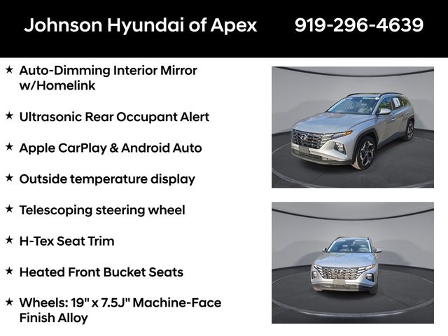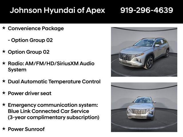 10.25" Digital Instrument Cluster, Apple CarPlay & Android Auto, Auto-Dimming Interior Mirror w/Homelink, Convenience Package, Delay-off headlights, Dual Automatic Temperature Control, Emergency communication system: Blue Link Connected Car Service (3-year complimentary subscription), Fully automatic headlights, H-Tex Seat Trim, Heated door mirrors, Heated Front Bucket Seats, Leather-Wrapped Shift Knob, Leather-Wrapped Steering Wheel, LED Interior Lights (Room, Map), Option Group 02, Outside temperature display, Power driver seat, Power Liftgate, Power Sunroof, Radio: AM/FM/HD/SiriusXM Audio System, Telescoping steering wheel, Ultrasonic Rear Occupant Alert, Wheels: 19" x 7.5J" Machine-Face Finish Alloy.