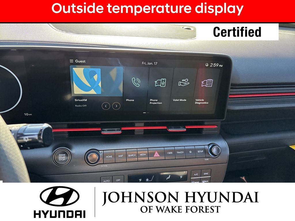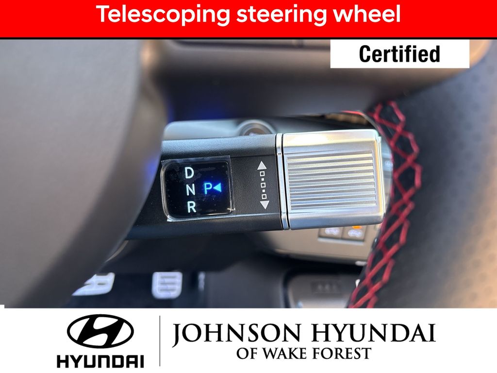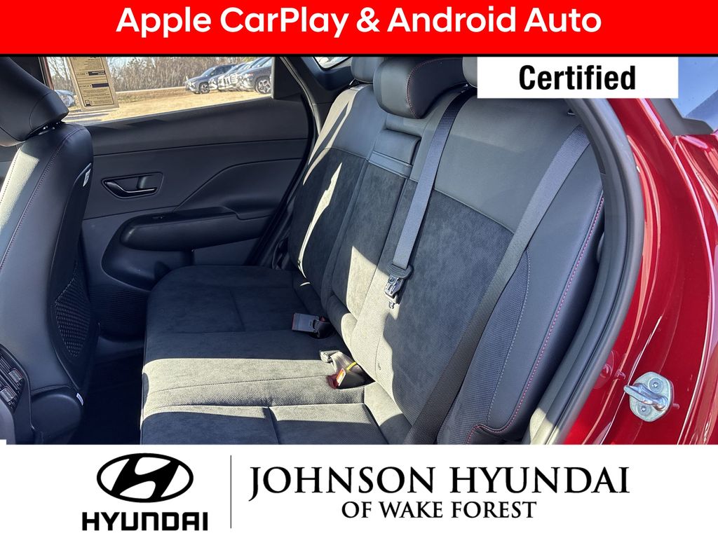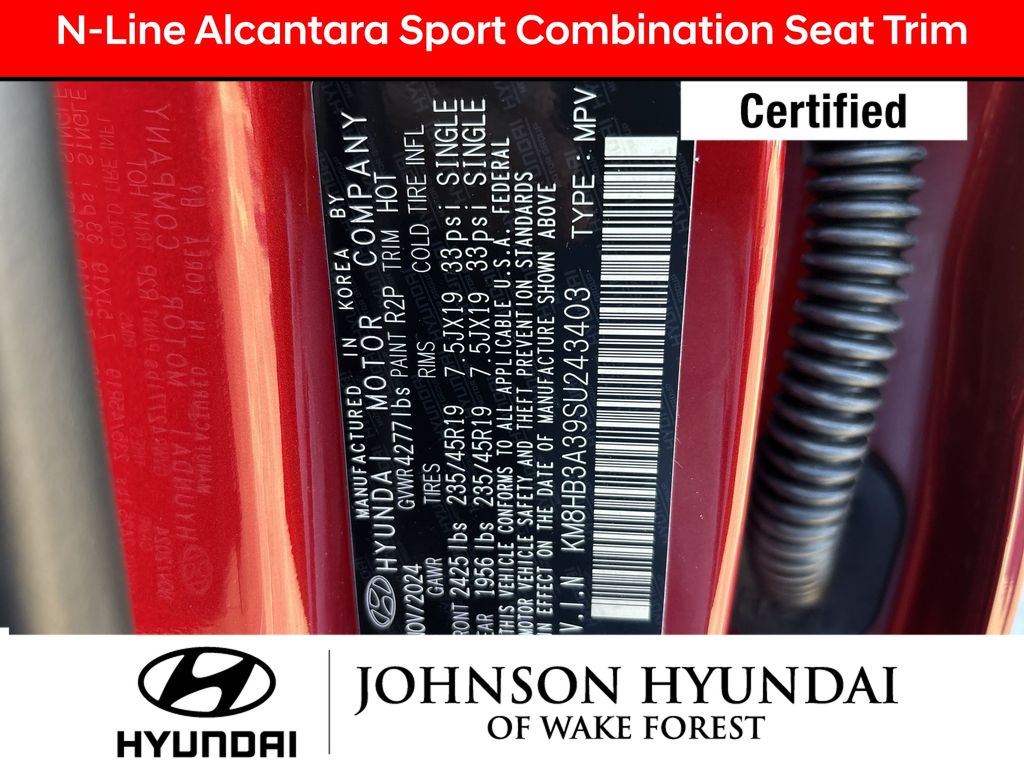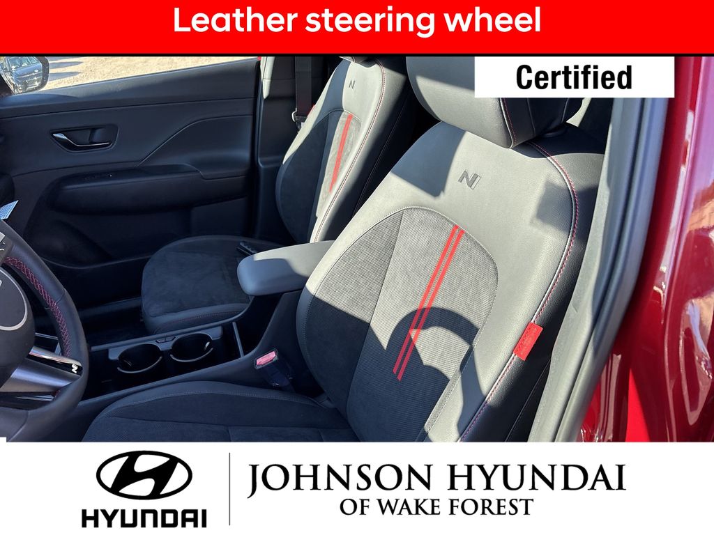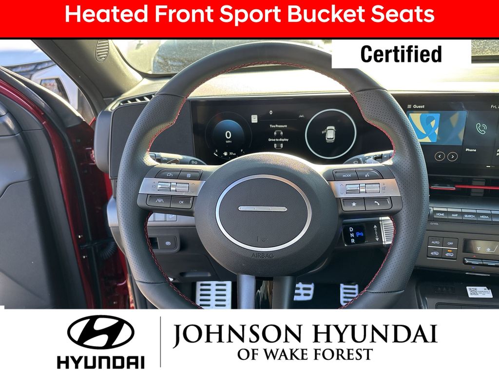 Hyundai Certified Used Vehicles Certified, Apple CarPlay & Android Auto, Automatic temperature control, Electronic Stability Control, Emergency communication system: Bluelink+, Exterior Parking Camera Rear, Front dual zone A/C, Fully automatic headlights, Heated door mirrors, Heated Front Sport Bucket Seats, Leather steering wheel, N-Line Alcantara Sport Combination Seat Trim, Option Group 01, Outside temperature display, Power door mirrors, Power driver seat, Radio: AM/FM/HD Radio/SiriusXM Audio System, Steering wheel mounted audio controls, Telescoping steering wheel, Wheels: 19" x 7.5J Metallic Alloy, 4-Wheel Disc Brakes, 6 Speakers, ABS brakes, Air Conditioning, All Season Fitted Liners, Alloy wheels, AM/FM radio: SiriusXM, Auto High-beam Headlights, Brake assist, Bumpers: body-color, Cargo Net, Cargo Tray, Carpeted Floor Mats, Column-Mounted Shift-By-Wire, Delay-off headlights, Driver door bin, Driver vanity mirror, Dual front impact airbags, Dual front side impact airbags, First Aid Kit, Front anti-roll bar, Front Bucket Seats, Front Center Armrest, Front reading lights, Front wheel independent suspension, Heated front seats, Illuminated entry, Low tire pressure warning, Mud Guards, Occupant sensing airbag, Overhead airbag, Panic alarm, Passenger door bin, Passenger vanity mirror, Power steering, Power windows, Rear seat center armrest, Rear window defroster, Rear window wiper, Remote keyless entry, Security system, Speed control, Speed-sensing steering, Split folding rear seat, Spoiler, Tachometer, Tilt steering wheel, Traction control, Trip computer, Turn signal indicator mirrors, Variably intermittent wipers, Apple CarPlay & Android Auto, Automatic temperature control, Electronic Stability Control, Emergency communication system: Bluelink+, Exterior Parking Camera Rear, Front dual zone A/C, Fully automatic headlights, Heated door mirrors, Heated Front Sport Bucket Seats, Leather steering wheel, N-Line Alcantara Sport Combination Seat Trim, Option Group 01, Outside temperature display, Power door mirrors, Power driver seat, Radio: AM/FM/HD Radio/SiriusXM Audio System, Steering wheel mounted audio controls, Telescoping steering wheel, Wheels: 19" x 7.5J Metallic Alloy.