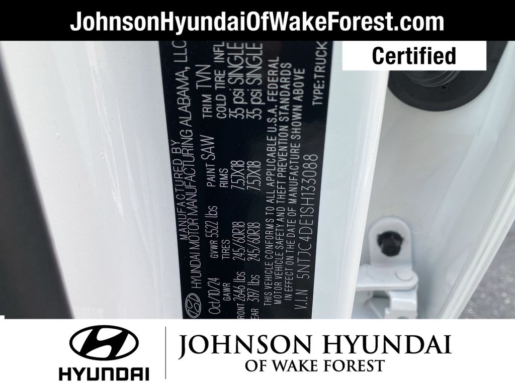 CARFAX CERTIFIED ONE OWNER - NO ACCIDENTS, CARFAX CERTIFIED ONE OWNER, Hyundai Certified Used Vehicles Certified, 18" x 7.5J Alloy Wheels, 4-Wheel Disc Brakes, 4.081 Axle Ratio, 6 Speakers, ABS brakes, Air Conditioning, Alloy wheels, AM/FM radio: SiriusXM, Apple CarPlay & Android Auto, Auto High-beam Headlights, Auto-leveling suspension, Automatic temperature control, Bed Cargo Net, Brake assist, Bumpers: body-color, Cargo Net, Carpeted Floor Mats, Compass, Delay-off headlights, Driver door bin, Driver vanity mirror, Dual front impact airbags, Dual front side impact airbags, Electronic Stability Control, Emergency communication system: Bluelink+, Exterior Parking Camera Rear, First Aid Kit, Four wheel independent suspension, Front anti-roll bar, Front Bucket Seats, Front Center Armrest, Front dual zone A/C, Front reading lights, Fully automatic headlights, H-Tex Leatherette Seat Trim, Heated door mirrors, Heated Front Bucket Seats, Heated front seats, Illuminated entry, Low tire pressure warning, Occupant sensing airbag, Option Group 01, Outside temperature display, Overhead airbag, Overhead console, Panic alarm, Passenger door bin, Passenger vanity mirror, Power door mirrors, Power driver seat, Power moonroof, Power steering, Power windows, Radio data system, Radio: AM/FM/HD Audio System, Rear anti-roll bar, Rear reading lights, Rear seat center armrest, Rear side impact airbag, Rear step bumper, Rear window defroster, Remote keyless entry, Roadside Assistance Kit, Security system, Speed control, Speed-sensing steering, Split folding rear seat, Spoiler, Steering wheel mounted audio controls, Tachometer, Telescoping steering wheel, Tilt steering wheel, Traction control, Trip computer, Turn signal indicator mirrors, Variably intermittent wipers, Wheel Locks.