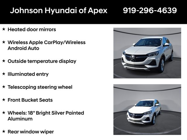 2 USB Ports w/Auxiliary Input Jack, Auto High-beam Headlights, Automatic temperature control, Electronic Stability Control, Emergency communication system: OnStar and Buick connected services capable, Enhanced Performance 6-Speaker System, Front Bucket Seats, Front fog lights, Fully automatic headlights, Heated door mirrors, Illuminated entry, Outside temperature display, Power door mirrors, Preferred Equipment Group 1SB, Radio: 8" Diagonal Buick Infotainment System, Rear window defroster, Rear window wiper, Remote keyless entry, Ride & Handling Suspension, SiriusXM Radio, Steering wheel mounted audio controls, Telescoping steering wheel, Wheels: 18" Bright Silver Painted Aluminum, Wireless Apple CarPlay/Wireless Android Auto.