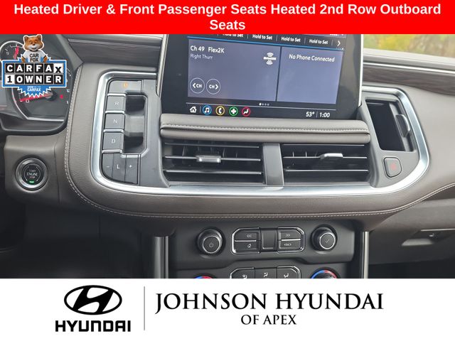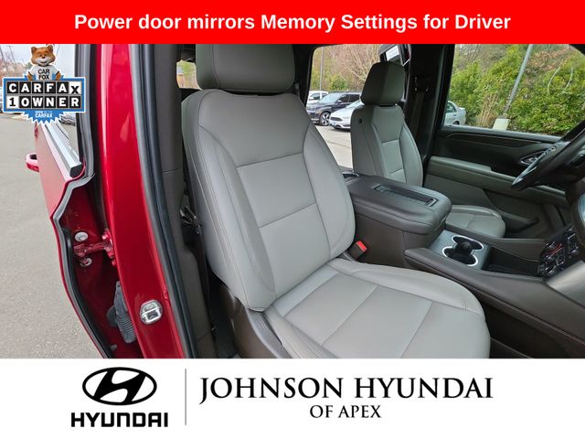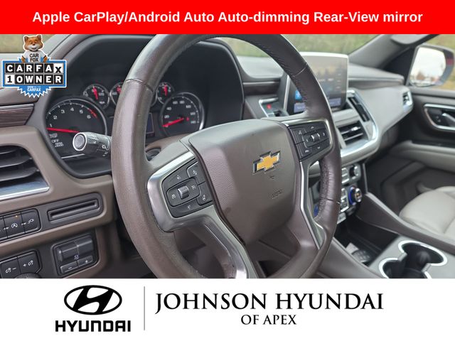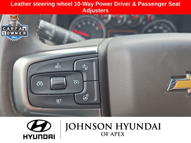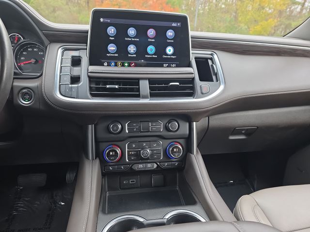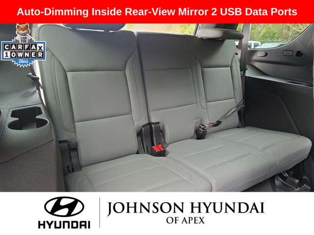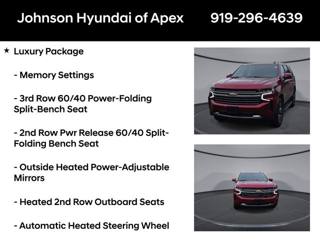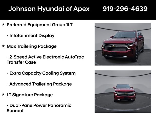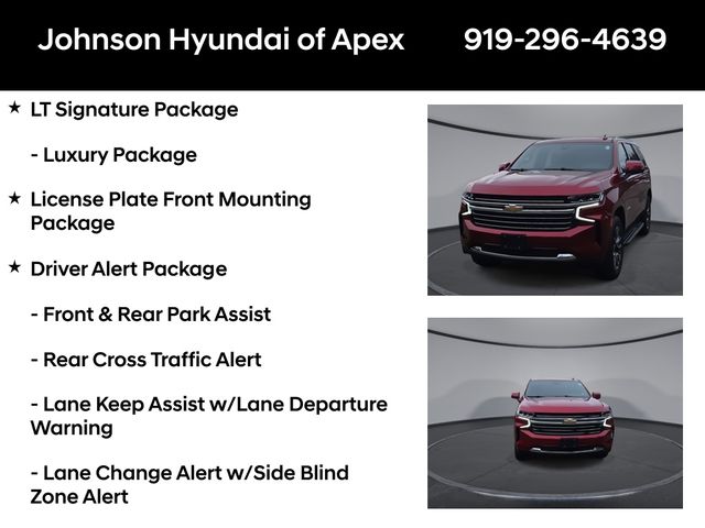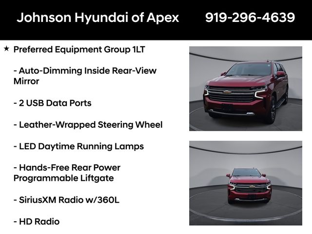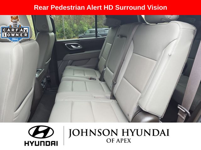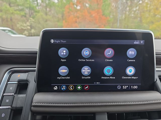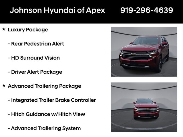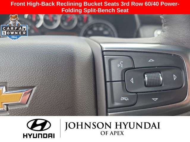 10-Way Power Driver & Passenger Seat Adjusters, 1st & 2nd Row Color-Keyed Carpeted Floor Mats, 2 USB Data Ports, 2-Speed Active Electronic AutoTrac Transfer Case, 2nd Row Pwr Release 60/40 Split-Folding Bench Seat, 3rd Row 60/40 Power-Folding Split-Bench Seat, Advanced Trailering Package, Advanced Trailering System, Apple CarPlay/Android Auto, Auto-Dimming Inside Rear-View Mirror, Auto-dimming Rear-View mirror, Automatic Heated Steering Wheel, Automatic temperature control, Bose 9-Speaker Stereo Audio System Feature, Bright Front & Rear Door Sill Plates, Color-Keyed Carpeting Floor Covering, Driver & Front Outboard Passenger Airbags, Driver Alert Package, Dual-Pane Power Panoramic Sunroof, Emergency communication system: OnStar and Chevrolet connected services capable, Extra Capacity Cooling System, Floor Console w/Storage Area, Front & Rear Park Assist, Front dual zone A/C, Front High-Back Reclining Bucket Seats, Fully automatic headlights, Hands-Free Rear Power Programmable Liftgate, HD Radio, HD Surround Vision, Heated 2nd Row Outboard Seats, Heated door mirrors, Heated Driver & Front Passenger Seats, Hitch Guidance w/Hitch View, Infotainment Display, Integrated Trailer Brake Controller, Lane Change Alert w/Side Blind Zone Alert, Lane Keep Assist w/Lane Departure Warning, Leather steering wheel, Leather-Wrapped Steering Wheel, LED Daytime Running Lamps, License Plate Front Mounting Package, LT Signature Package, Luxury Package, Max Trailering Package, Memory seat, Memory Settings, Memory Settings for Driver, Outside Heated Power-Adjustable Mirrors, Outside temperature display, Power door mirrors, Power driver seat, Power Liftgate, Power passenger seat, Power Tilt & Telescopic Steering Column, Preferred Equipment Group 1LT, Rear air conditioning, Rear Cross Traffic Alert, Rear Pedestrian Alert, Remote Start, SiriusXM Radio w/360L, Telescoping steering wheel, Universal Home Remote, Wheels: 20" x 9" Painted Aluminum.