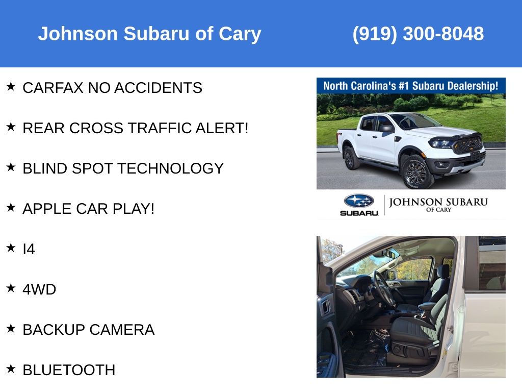 Oxford White 2023 Ford Ranger XLT 4WD 10-Speed Automatic EcoBoost 2.3L I4 GTDi DOHC Turbocharged VCT CARFAX NO ACCIDENTS, REAR CROSS TRAFFIC ALERT!, BLIND SPOT TECHNOLOGY, APPLE CAR PLAY!, I4, 4WD, BACKUP CAMERA, BLUETOOTH, 4WD.