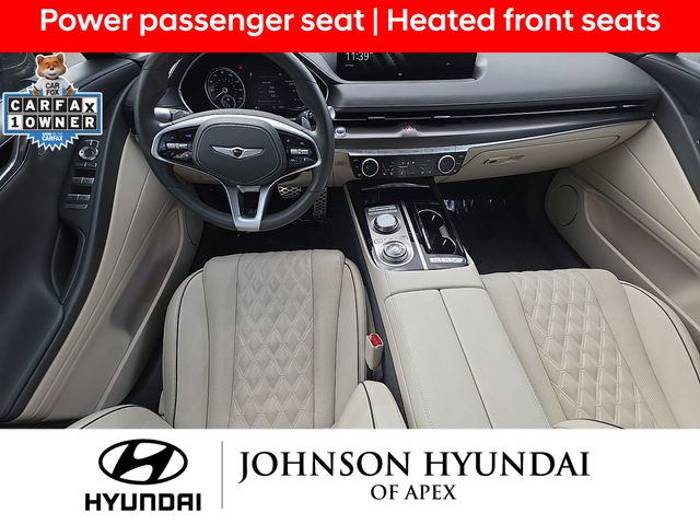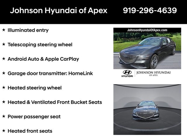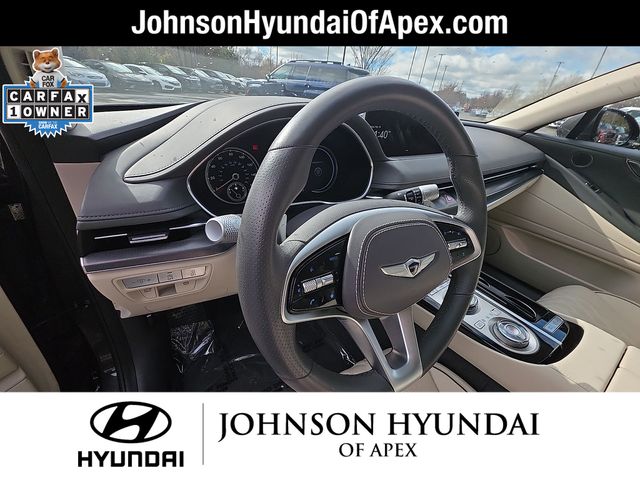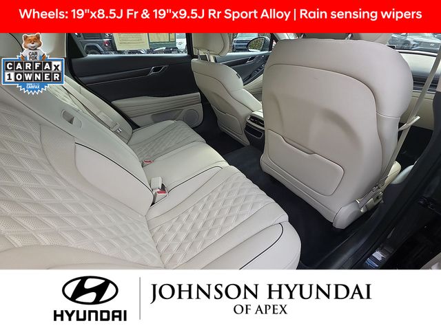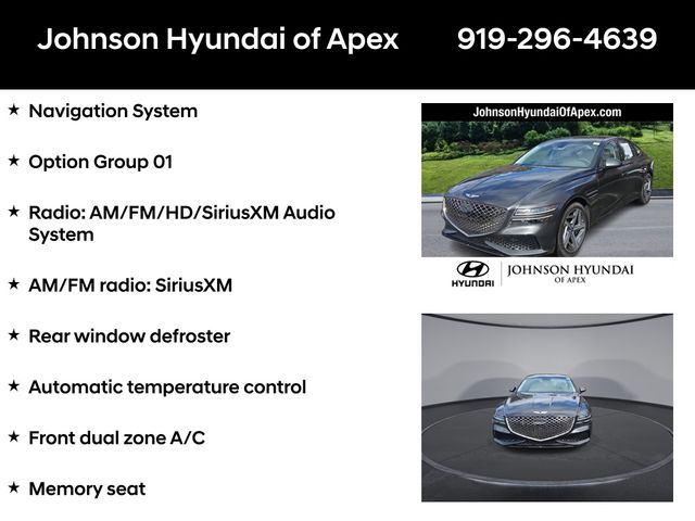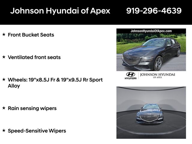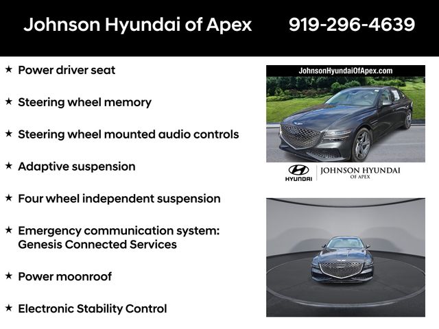 Adaptive suspension, AM/FM radio: SiriusXM, Android Auto & Apple CarPlay, Auto High-beam Headlights, Auto-dimming door mirrors, Automatic temperature control, Electronic Stability Control, Emergency communication system: Genesis Connected Services, Exterior Parking Camera Rear, Four wheel independent suspension, Front Bucket Seats, Front dual zone A/C, Fully automatic headlights, Garage door transmitter: HomeLink, Heated & Ventilated Front Bucket Seats, Heated door mirrors, Heated front seats, Heated steering wheel, Illuminated entry, Leather steering wheel, Memory seat, Navigation System, Option Group 01, Outside temperature display, Power door mirrors, Power driver seat, Power moonroof, Power passenger seat, Radio: AM/FM/HD/SiriusXM Audio System, Rain sensing wipers, Rear window defroster, Speed-Sensitive Wipers, Steering wheel memory, Steering wheel mounted audio controls, Telescoping steering wheel, Ventilated front seats, Wheels: 19"x8.5J Fr & 19"x9.5J Rr Sport Alloy.