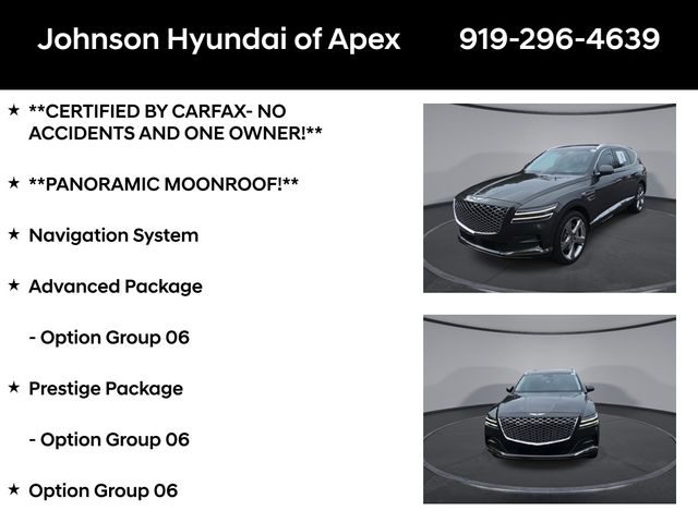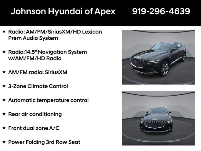 **CERTIFIED BY CARFAX- NO ACCIDENTS AND ONE OWNER!**, **PANORAMIC MOONROOF!**, 12.3" 3D Digital Instrument Cluster, 2nd Row Vanity Mirrors, 3-Zone Climate Control, Adaptive suspension, Advanced Package, AM/FM radio: SiriusXM, Android Auto & Apple CarPlay, Auto High-beam Headlights, Auto tilt-away steering wheel, Auto-dimming door mirrors, Auto-dimming Rear-View mirror, Automatic temperature control, Blind-Spot View Monitor, Electronic Limited Slip Differential, Electronic Stability Control, Emergency communication system: Genesis Connected Services, Ergo Motion Driver Seat, Exterior Parking Camera Rear, Forward Attention Warning, Four wheel independent suspension, Front dual zone A/C, Fully automatic headlights, Garage door transmitter: HomeLink, Genuine wood console insert, Genuine wood dashboard insert, Genuine wood door panel insert, Head-Up Display, Heated & Ventilated Front Bucket Seats, Heated 2nd Row Seats, Heated door mirrors, Heated front seats, Heated steering wheel, Illuminated Door Scuff Plates, Leather Seating Surfaces, Leather steering wheel, Memory seat, Nappa Leather Seating Surfaces, Navigation System, Option Group 06, Outside temperature display, Power 2nd Row Outboard Seats, Power Cushion Extension & Bolster, Power Door Closure, Power door mirrors, Power driver seat, Power Folding 3rd Row Seat, Power Liftgate, Power moonroof, Power passenger seat, Power Rear Door Shades, Prestige Package, Radio: AM/FM/SiriusXM/HD Lexicon Prem Audio System, Radio:14.5" Navigation System w/AM/FM/HD Radio, Rain sensing wipers, Rear air conditioning, Rear window wiper, Remote Smart Parking Assist, Reverse Parking Collision-Avoidance Assist, Speed-Sensitive Wipers, Steering wheel memory, Steering wheel mounted audio controls, Suede Headliner, Surround View Monitor, Telescoping steering wheel, Ventilated 2nd Row Outboard Seats, Wheels: 22" x 9.5J Alloy.