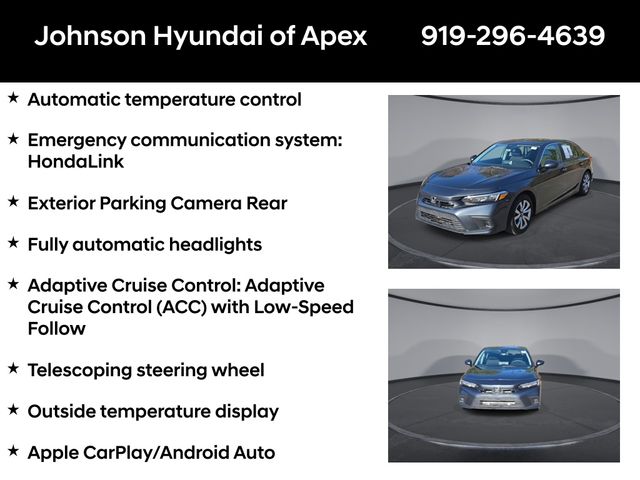Adaptive Cruise Control: Adaptive Cruise Control (ACC) with Low-Speed Follow, Apple CarPlay/Android Auto, Automatic temperature control, Emergency communication system: HondaLink, Exterior Parking Camera Rear, Fully automatic headlights, Outside temperature display, Telescoping steering wheel.