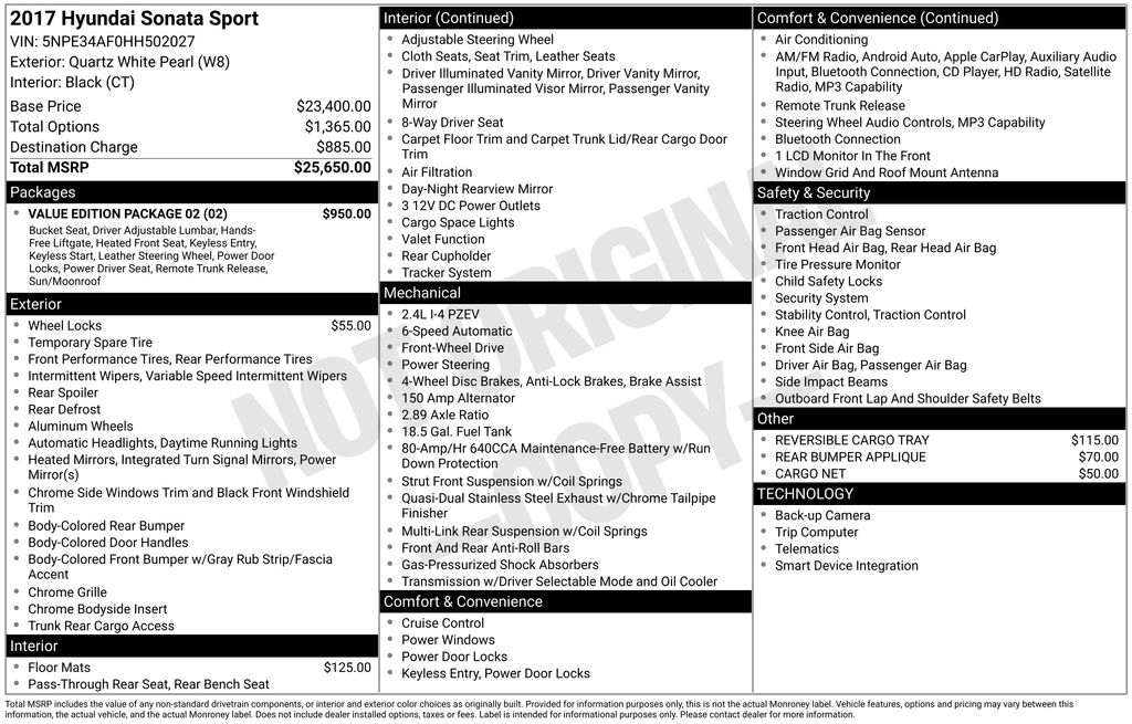 Quartz White Pearl 2017 Hyundai Sonata Sport FWD 6-Speed Automatic with Shiftronic 2.4L I4 DGI DOHC 16V PZEV 185hp Recent Trade In, Sunroof, Black w/Leather Bolster/Cloth Insert Seating Surfaces, Chrome Exterior Door Handles, Conventional Sunroof, Door Handle Welcome Light, Hands-Free Smart Trunk Opener, Heated Front Sport Seats, Leather Bolster/Cloth Insert Seating Surfaces, Leather Wrapped Steering Wheel & Shift Knob, Option Group 02, Proximity Key Entry w/Push Button Start, Value Edition Package 02, Wheels: 17 x 7.0J Aluminum Alloy.