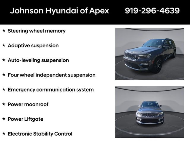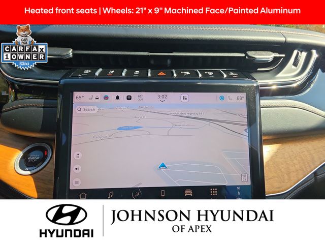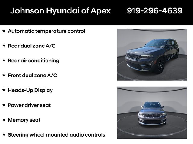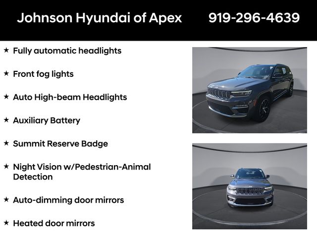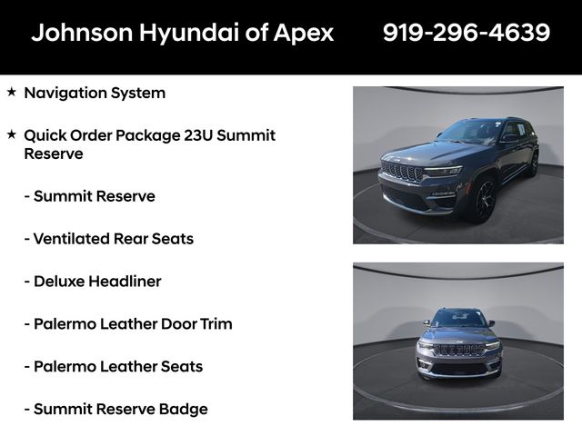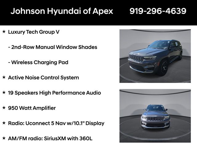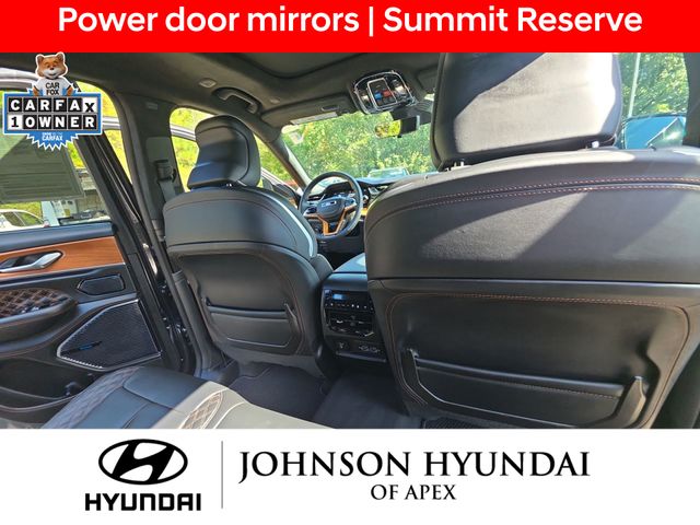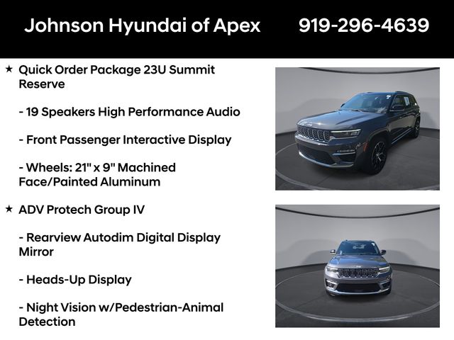 19 Speakers High Performance Audio, 2nd-Row Manual Window Shades, 950 Watt Amplifier, Active Noise Control System, Adaptive suspension, ADV Protech Group IV, AM/FM radio: SiriusXM with 360L, Audio memory, Auto High-beam Headlights, Auto-dimming door mirrors, Auto-dimming Rear-View mirror, Auto-leveling suspension, Automatic temperature control, Auxiliary Battery, Deluxe Headliner, Electronic Stability Control, Emergency communication system, Four wheel independent suspension, Front dual zone A/C, Front fog lights, Front Passenger Interactive Display, Fully automatic headlights, Garage door transmitter, Genuine wood dashboard insert, Genuine wood door panel insert, Heads-Up Display, Heated door mirrors, Heated front seats, Heated rear seats, Heated steering wheel, Illuminated entry, Leather steering wheel, Luxury Tech Group V, Memory seat, Nappa Leather Seats, Navigation System, Night Vision w/Pedestrian-Animal Detection, Outside temperature display, Palermo Leather Door Trim, Palermo Leather Seats, Power door mirrors, Power driver seat, Power Liftgate, Power moonroof, Power passenger seat, Quick Order Package 23U Summit Reserve, Radio: Uconnect 5 Nav w/10.1" Display, Rain sensing wipers, Rear air conditioning, Rear dual zone A/C, Rearview Autodim Digital Display Mirror, Speed-Sensitive Wipers, Steering wheel memory, Steering wheel mounted audio controls, Summit Reserve, Summit Reserve Badge, Telescoping steering wheel, Ventilated front seats, Ventilated Rear Seats, Wheels: 21" x 9" Machined Face/Painted Aluminum, Wireless Charging Pad.