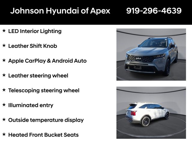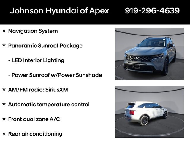 AM/FM radio: SiriusXM, Apple CarPlay & Android Auto, Automatic temperature control, Emergency communication system: UVO Link, Exterior Parking Camera Rear, Front dual zone A/C, Fully automatic headlights, Heated door mirrors, Heated Front Bucket Seats, Illuminated entry, Leather Shift Knob, Leather steering wheel, LED Interior Lighting, Navigation System, Outside temperature display, Panoramic Sunroof Package, Power door mirrors, Power driver seat, Power Sunroof w/Power Sunshade, Rear air conditioning, Smart Key w/ Push Button and Remote Start, SynTex Artificial Leather Seat Trim, Telescoping steering wheel, Wheels: 7.5J x 18" Gloss Black Alloy.