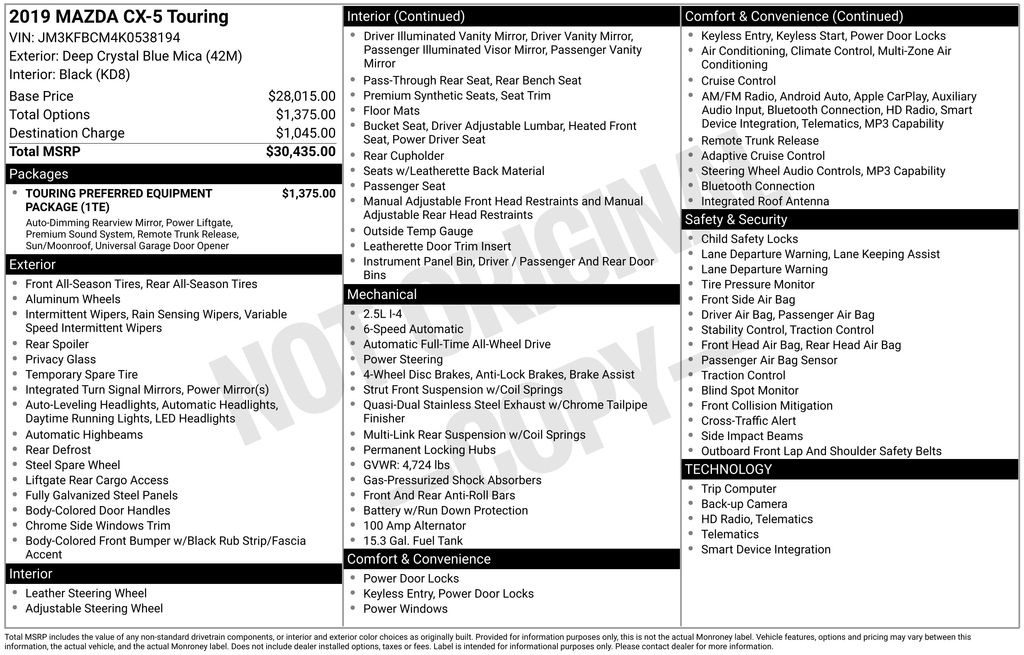 Deep Crystal Blue Mica 2019 Mazda CX-5 Touring AWD 6-Speed Automatic SKYACTIV® 2.5L 4-Cylinder DOHC 16V