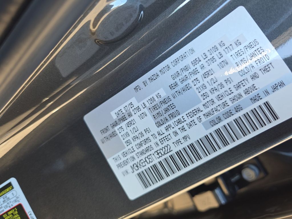 12 Speakers, 3rd row seats: bench, 4-Wheel Disc Brakes, ABS brakes, Air Conditioning, All Weather Floor Mats - Captains Chairs, Alloy wheels, AM/FM radio: SiriusXM, Auto High-beam Headlights, Auto-dimming door mirrors, Auto-dimming Rear-View mirror, Automatic temperature control, Brake assist, Bumpers: body-color, Cargo Blocks, Chrome Liftgate Garnish, Compass, Cross Bars - Silver, Delay-off headlights, Driver door bin, Driver vanity mirror, Dual front impact airbags, Dual front side impact airbags, E911 Automatic Emergency Notification, Electronic Stability Control, Emergency communication system: MAZDA CONNECT, First Aid Kit, Four wheel independent suspension, Front anti-roll bar, Front Bucket Seats, Front Center Armrest w/Storage, Front dual zone A/C, Front reading lights, Fully automatic headlights, Garage door transmitter: HomeLink, Heads-Up Display, Heated door mirrors, Heated front seats, Heated rear seats, Heated steering wheel, Heated/Ventilated Front Bucket Seats, Illuminated entry, Infotainment System Voice Command, Knee airbag, Leather Shift Knob, Leather steering wheel, Low tire pressure warning, Machine Gray Metallic Paint Charge, Mazda Connected Services, Mazda Online Navigation, Memory seat, Nappa Leather Seat Trim, Navigation system: MAZDA CONNECT, Occupant sensing airbag, Outside temperature display, Overhead airbag, Overhead console, Panic alarm, Passenger door bin, Passenger vanity mirror, Power door mirrors, Power driver seat, Power Liftgate, Power moonroof, Power passenger seat, Power steering, Power windows, Radio Broadcast Data System Program Information, Radio data system, Radio: AM/FM w/HD/Bose 12-Speaker Sound System, Rain sensing wipers, Rear air conditioning, Rear anti-roll bar, Rear reading lights, Rear seat center armrest, Rear window defroster, Rear window wiper, Remote keyless entry, Roadside Assistance Kit, Security system, SMS Text Msg Audio Delivery & Reply, Speed control, Speed-sensing steering, Split folding rear seat, Spoiler, Steering wheel memory, Steering wheel mounted audio controls, Tachometer, Telescoping steering wheel, Tilt steering wheel, Traction control, Trip computer, Turn signal indicator mirrors, Variably intermittent wipers, Ventilated front seats, Ventilated rear seats, Wheels: 21" x 9.5J Machine Cut Aluminum Alloy.