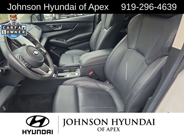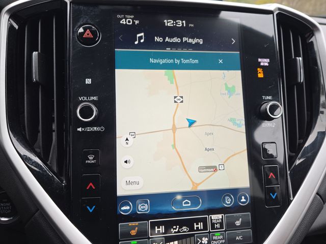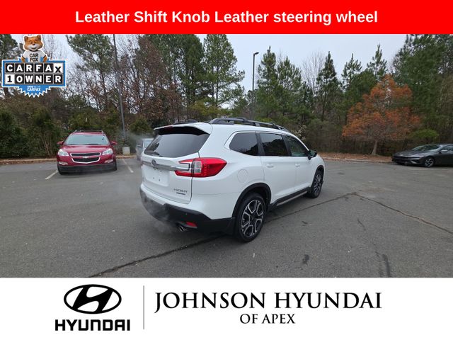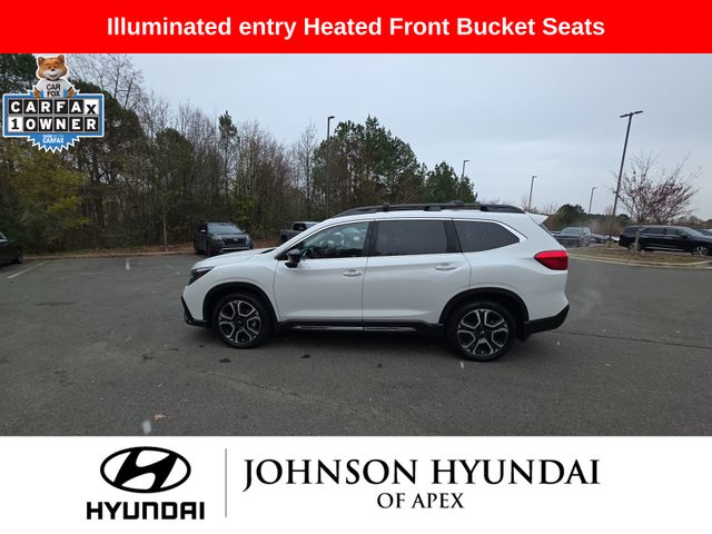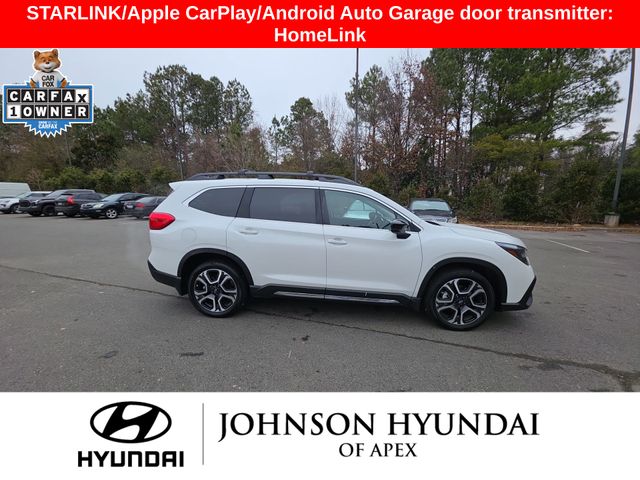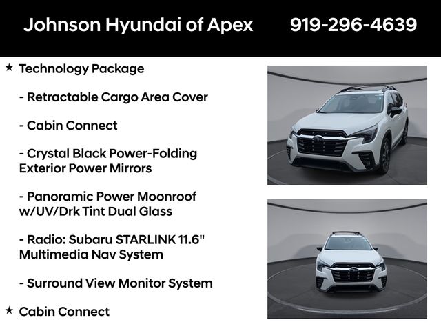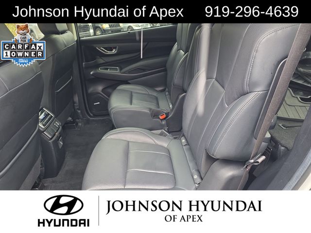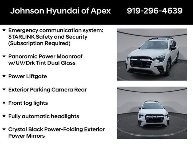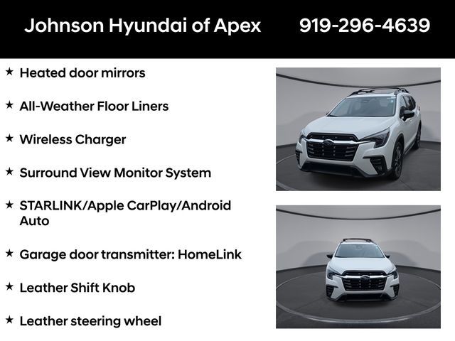 All-Weather Floor Liners, Auto-dimming Rear-View mirror, Automatic temperature control, Cabin Connect, Crystal Black Power-Folding Exterior Power Mirrors, Emergency communication system: STARLINK Safety and Security (Subscription Required), Exterior Parking Camera Rear, Front dual zone A/C, Front fog lights, Fully automatic headlights, Garage door transmitter: HomeLink, Heated door mirrors, Heated Front Bucket Seats, Heated rear seats, Heated steering wheel, HVAC memory, Illuminated entry, Leather Shift Knob, Leather steering wheel, Memory seat, Outside temperature display, Panoramic Power Moonroof w/UV/Drk Tint Dual Glass, Perforated Leather-Trimmed Upholstery, Power driver seat, Power Liftgate, Power passenger seat, Radio: Subaru STARLINK 11.6" Multimedia Nav System, Radio: Subaru STARLINK 11.6" Multimedia Plus System, Reclining 3rd row seat, Retractable Cargo Area Cover, STARLINK/Apple CarPlay/Android Auto, Surround View Monitor System, Technology Package, Telescoping steering wheel, Wheels: 20" x 7.5 J Dk Gray Alloy w/Machine Finish, Wireless Charger.