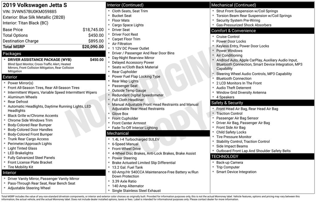 Blue Silk Metallic 2019 Volkswagen Jetta 1.4T S FWD 6-Speed Manual 1.4L TSI Titan Black w/Cloth Seat Trim.